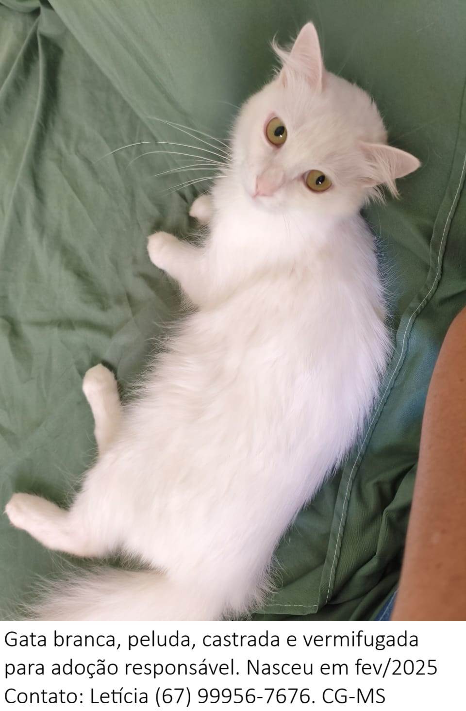 Gatinha fêmea branca e peluda, nascida em janeiro de 2025, olhos de cor mostarda, para adoção responsável.